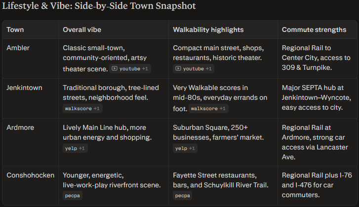 When you’re comparing Ambler vs Jenkintown vs Ardmore vs Conshohocken, it helps to break the decision into a few key factors.