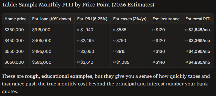 The point: online calculators that only show principal + interest can understate your real monthly housing cost by hundreds of dollars.