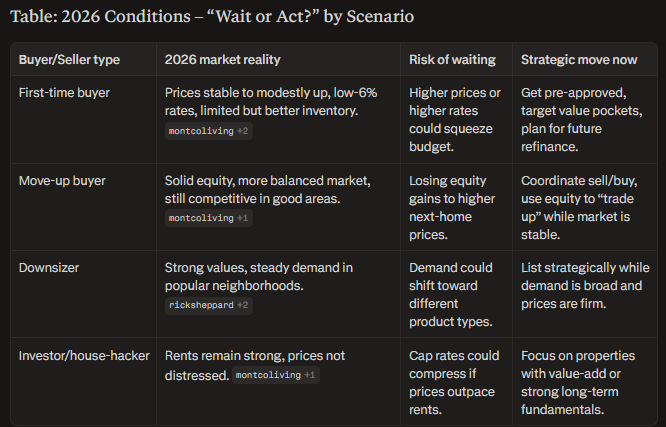 In simple terms, the market is more balanced—but not weak. That means the “I’ll wait for prices to drop significantly” strategy doesn’t align with what local Montgomery County and regional forecasts are showing for 2026. Instead, most projections call for continued low‑to‑moderate inventory and modest appreciation.